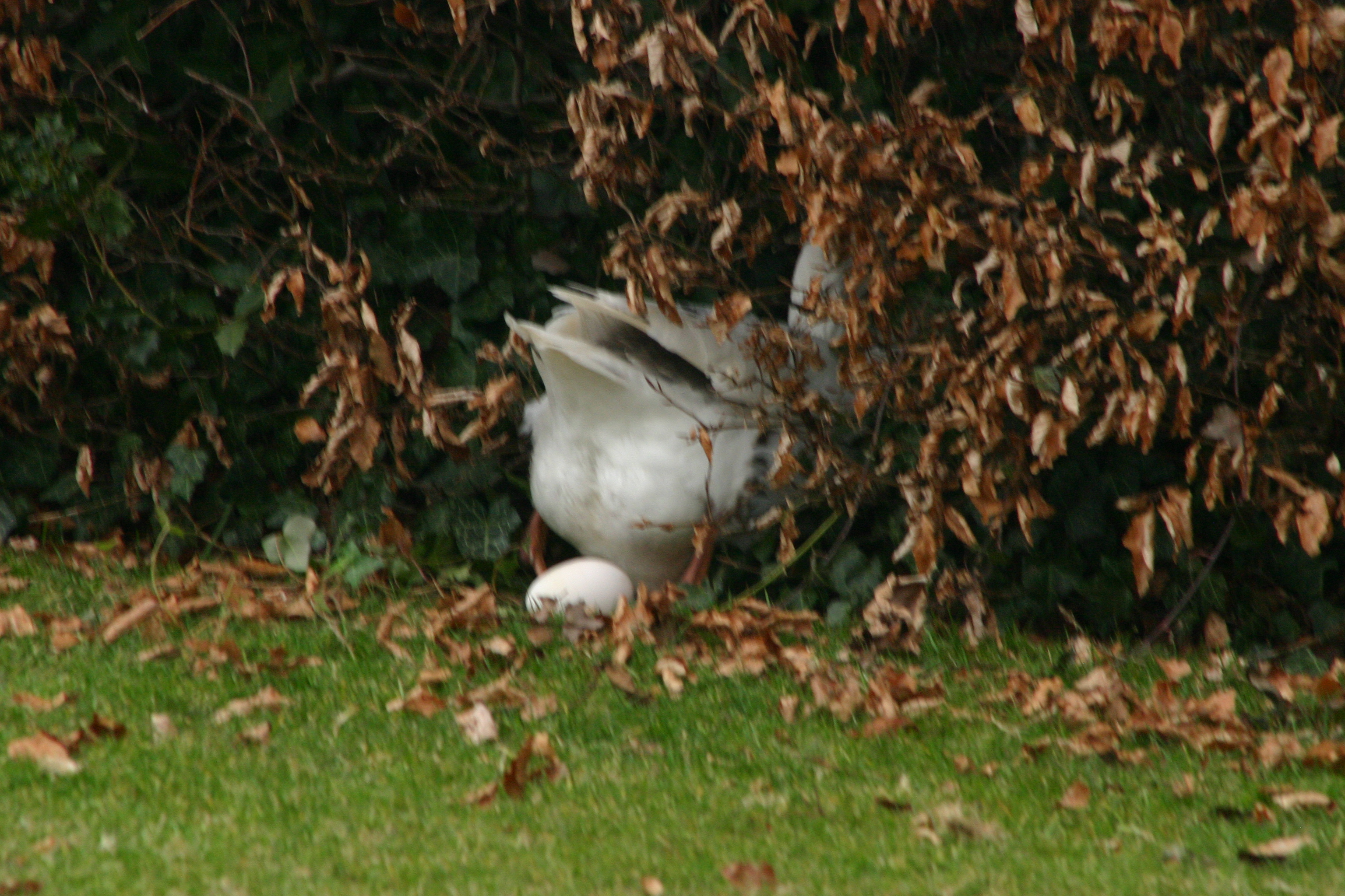 Het op en neer wandelen begint weer. Dat duurt zo’n beetje de hele dag. Ik krijg behoorlijk medelijden met haar. Het ei zit haar duidelijk in de weg. Uiteindelijk wordt ook dit ei gelegd. Toevallig zit ze dan op haar nest in de beukenhaag. Tegen de avond besluiten we om het ei daar weg te halen. Mocht er een marter komen die het voorzien heeft op Pieps ei dan kan ze geen kant op als ze met haar kop in de haag zit. In het verleden heeft de marter al eens eerder toegeslagen bij in de wei broedende ganzen. De betreffende gans kon toen geen kant op waarna ze in haar nek werd gebeten. Ze is toen dood gebloed. En daarvan wil ik echt niet dat dit Piep overkomt.