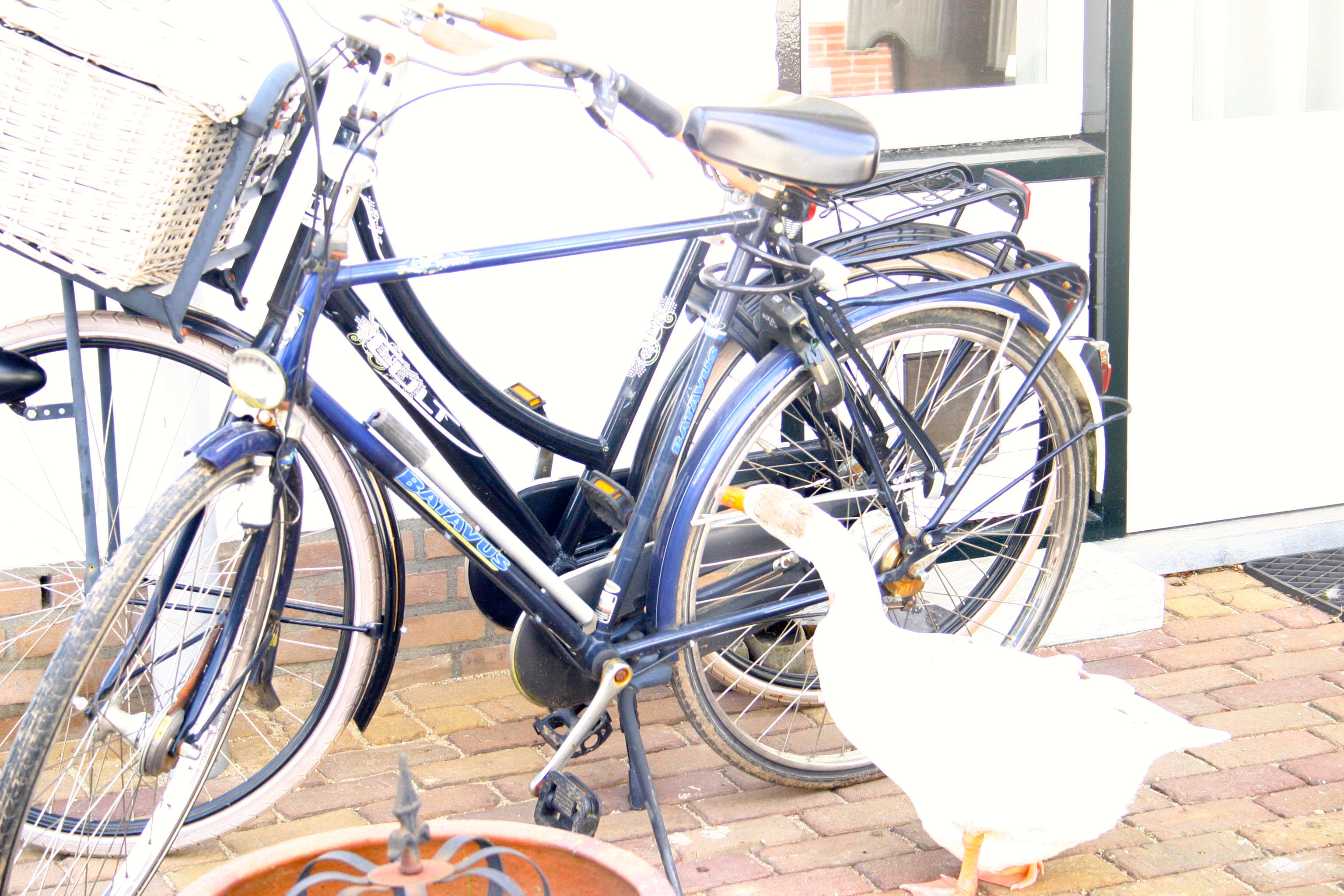 O ja, ik moet vooral manliefs oude fiets niet vergeten. Een aantal uurtjes per dag worden door Piep besteedt aan het molesteren van deze fiets. Uiteraard van de plastic onderdelen. De fiets bezit op dit moment geen jasbeschermers meer, alleen nog een lege huls waarin de plastic heeft gezeten. Als we in de serre zitten horen we dat Piep hard aan ’t werk is doordat ze steeds aan de bagagehouders trekt. Wat een repeterend petsend geluid geeft. Leuke achtergrondmuziek. IMG_8002 Ook staat de band plat. Alweer. Piep frunnikt namelijk aan het dopje van het ventiel waardoor de band leeg loopt. Niet dat ik dat in eerste instantie in de gaten had. Op een bepaald moment hadden we onze zuipfietsen nodig (ja, zo noemen we deze), maar stond die van manlief leeg. Dus moest deze geplakt worden. Op een goede dag de fiets op zijn kop gezet, emmer water gevuld, plaksetje tevoorschijn gehaald (mmm, waar ligt dat ook alweer?) en op zoek gegaan naar HET gaatje. Het duurde even maar nee, niks te vinden. Band dan maar eens goed oppompen en kijken hoe lang het duurt voordat hij leeg loopt. Mmm, hij loopt niet leeg… Raar. Als ik even later weer terug kom uit de serre zie ik Piep aan het ventiel frunikken. Probleem opgelost. Piep saboteert ons uitje door de band leeg te laten lopen! Op dit moment staat de band weer leeg. Maar we weten nu hoe dit komt. Kwestie van even oppompen voordat we vertrekken dan maar.