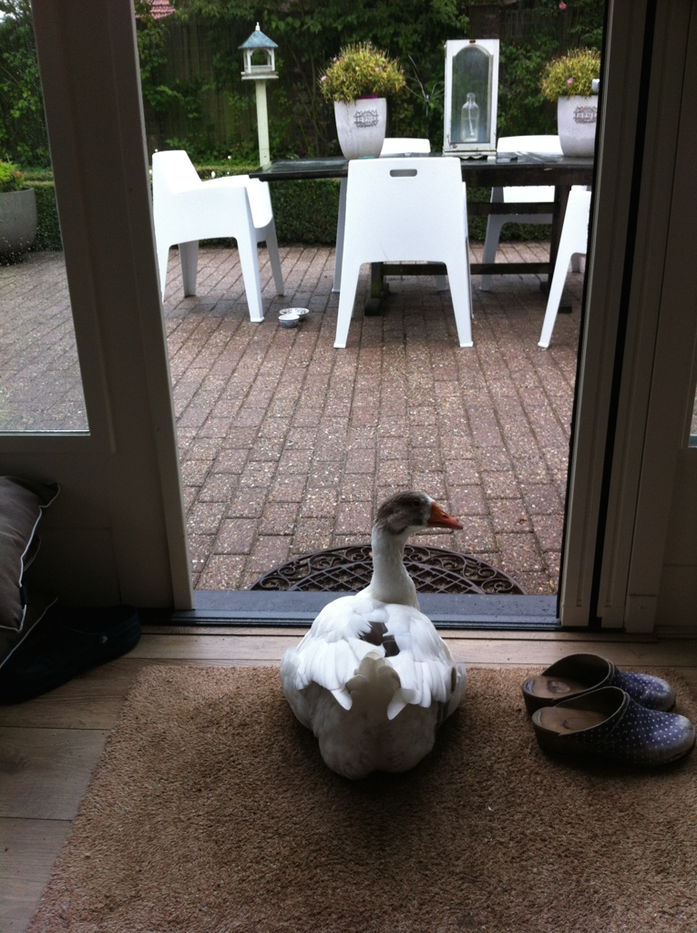 Uiteindelijk vind ik het goed geweest en ga ik achter op de bank zitten met een kop koffie. Piep grijpt haar kans en komt er gezellig bij zitten. Ik zit net wat te tikken op de Ipad als de lucht weer betrekt en er dikke regendruppels vallen. Snel spullen bij elkaar rapen en verder tikken in de serre.