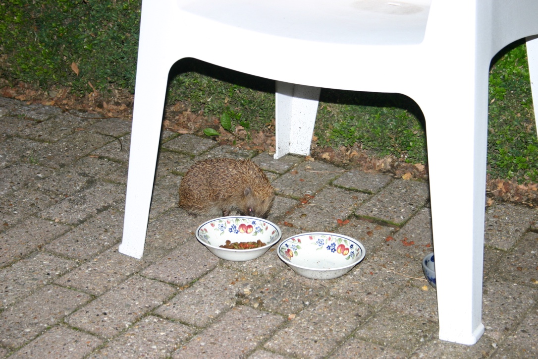 Wat is dat toch? Als we weer kijken staat het porseleinen bakje met de brokjes half rechtop. Dat kan niet uit zichzelf zo gaan en blijven staan! Daar heeft dat bakje hulp bij nodig. En ja hoor! Doordat het donker is zie je ze bijna niet maar er staat een egel met zijn voorpootjes in het bakje. Hij houdt het bakje schuin zodat hij goed aan de brokjes kan en staat hoorbaar lekker te knabbelen. Dan een gesnuif en een zacht geblaf. Aan de andere kant staat nog een egel. Blijkbaar concurrentie want de etende egel knort en blaft zodat hij alleen kan blijven genieten van de brokjes. De ander blijft in de buurt en uiteindelijk loopt nummertje één weg zodat nummertje twee kan eten. En ze eten me toch veel!