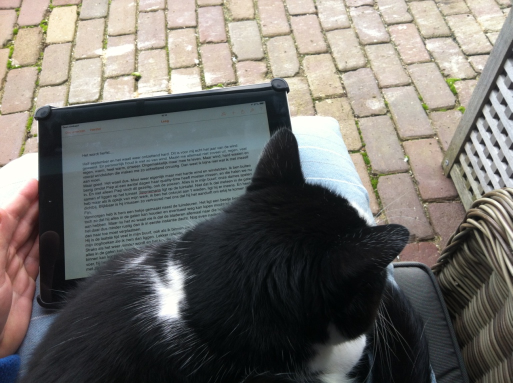 Wanneer ik naar binnen loop voor een kop koffie te halen, loopt hij met me mee. Hij heeft honger want hij begint zachtjes tegen me te mauwen. Na hem wat gegeven te hebben loop ik weer naar achteren met mijn tablet.