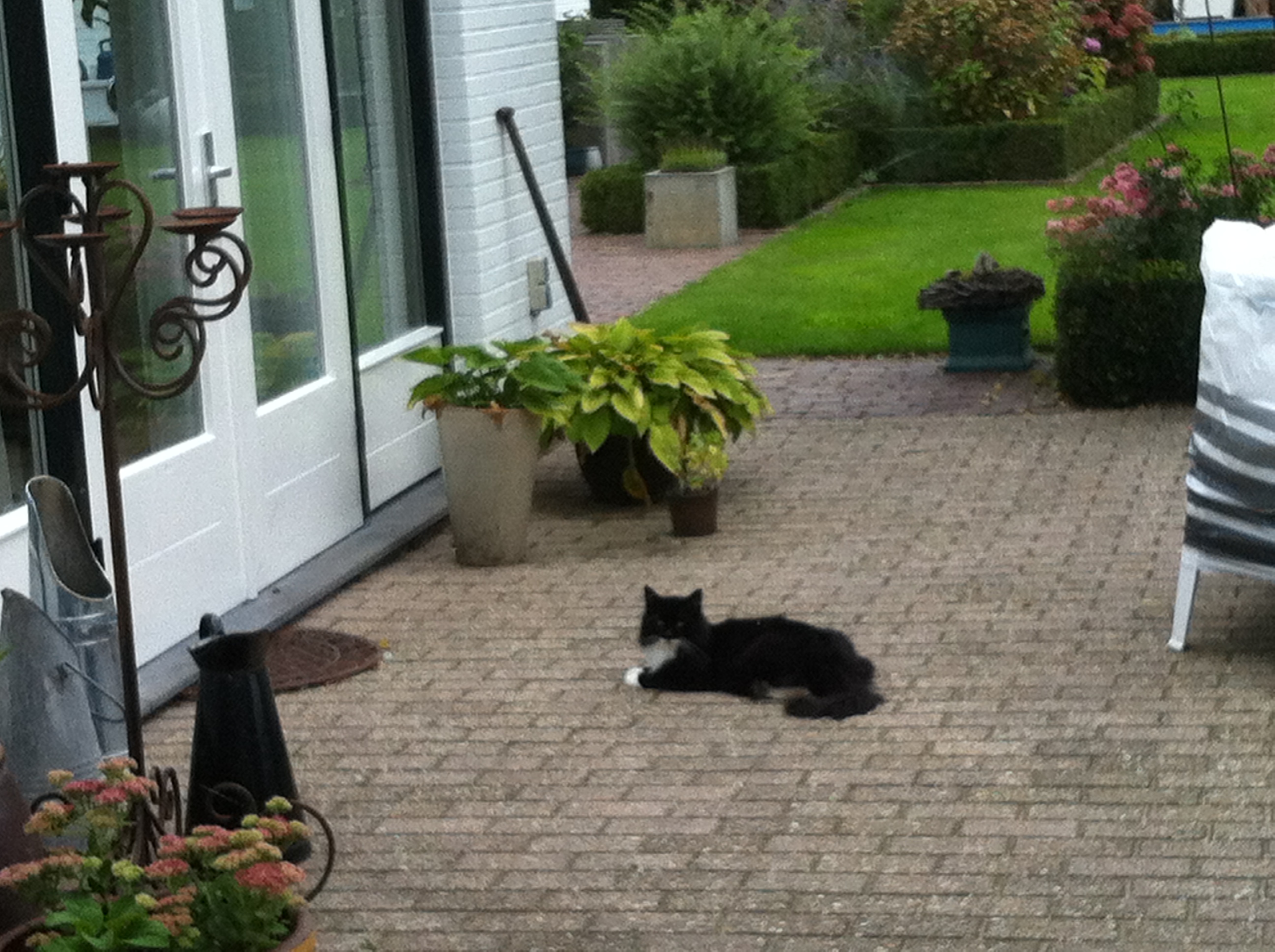 Zo rond vier uur komt hij meestal voor zijn middaghapje. Hij gaat nu demonstratief naar de deur liggen kijken of hij loopt wat rond en mauwt dan de hele tijd. En dus, goed afgericht als ik inmiddels ben, pak ik de melk, een blikje met zacht voer, de vork en ga dan naar buiten. Eerst het bakje met melk vullen en daarna het bakje waar het voer in komt naar me toe trekken, de folie lostrekken van het blikje voer, het voer in het bakje kiepen en dit dan prakken met de vork. En daarna het bakje op zijn plek terug schuiven. Vaste volgorde. Altijd.