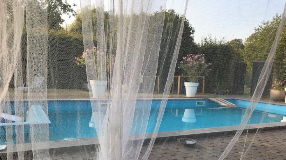 Wanneer we weer eens achter zitten ben ik het zat. Op zolder moet nog ergens een klamboe liggen. Meteen gaan zoeken en ja, hij ligt er inderdaad nog maar er zitten behoorlijk wat gaten in. Zo goed en zo kwaad mogelijk de gaten maar dichtgeknoopt en het hele ding opgehangen onder de dakplatanen. Zo! Nu kunnen we eindelijk op ons gemak zitten. Dacht zij heel naïef! Het is niet te geloven maar een van de wespenmormels heeft toch nog een gat gevonden en zich naar binnen gewerkt. De klamboe hebben we maar meteen in de afvalbak gegooid. Morgen moet er toch dus een nieuwe gehaald worden.