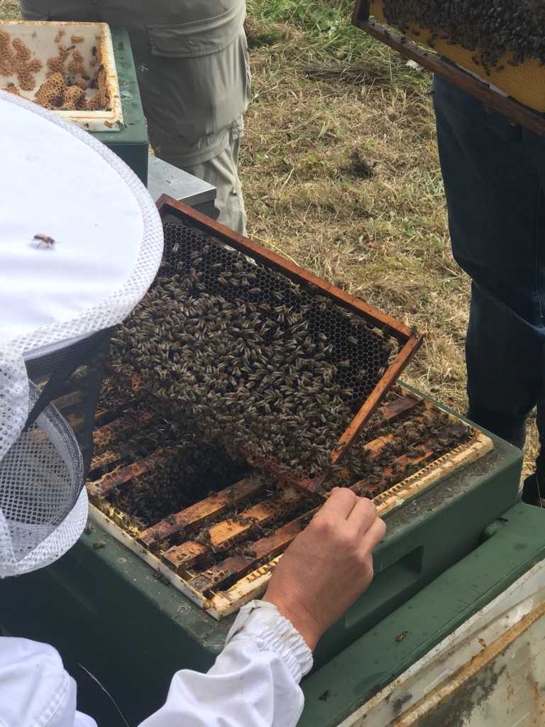 We krijgen uitleg over de opbouw van de kast, de opbouw van de raten, hoe maak je de raten het beste los, hoe zien de bijen eruit, waar bevindt zich de koningin, is ze gemerkt, met welke kleur dan? De ene vraag roept de andere op. In de eerste kast zien we wat de varroamijt kan aanrichten. Hier zien we bijtjes die halve of raar uitziende vleugeltjes hebben. De bijen zijn erg onrustig. Bovenin de kast zien we hoe de betreffende imker bezig is de varroamijt te behandelen middels mierenzuur. Het is nog niet duidelijk of deze kast het gaat redden. Wanneer de tweede kast wordt opengemaakt zien we sowieso het verschil tussen een houten en een stiroporkast. Het is fijn om hier uitleg over te krijgen omdat we zelf nog niet goed weten welke kasten we willen aanschaffen. Mijn voorkeur gaat eigenlijk uit naar houten kasten maar dat is meer omdat ik houten kasten beter bij ons in de wei vind passen. De voors-en tegens moet ik later nog eens met manlief bespreken. Maar wat vooral opvalt bij deze tweede kast is dat de bijen zoveel rustiger zijn. Alle raten hangen bomvol met bijen en na een tijdje zoeken vinden we zelfs de koningin. Intussen zwermen de bijen natuurlijk ruim om ons heen maar gek genoeg is de spanning verdwenen. Wat overblijft is een ongelooflijke gefascineerdheid in het bijen-systeem.