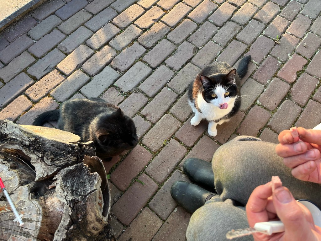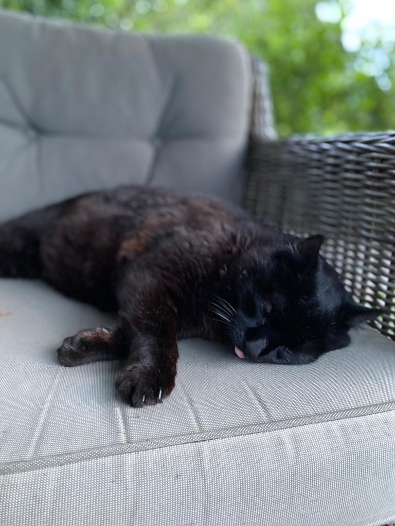 Maar hij gaf er een zomer vol liefde voor terug. ’s Morgens zat hij ons meestal op te wachten. Wanneer we in de tuin bezig waren bleef hij altijd in de buurt voor een aai of een kletsmomentje. Wanneer we buiten zaten nam hij of een stoel in beslag naast die van ons of hij klom op schoot. Toen hij dat nog kon althans. Later tilden we hem op zodat hij er toch bij kon zijn. Hij kon dan heerlijk knorren. Of rollen in het kattenkruid in het perkje naast onze stoel. Wanneer we een ijsje namen keek hij ons net zolang aan tot we hem het laatste restje lieten oplikken. Wanneer hij iets lekkers wilde keek hij je strak aan en begon hij met zijn tong over zijn mond te likken. Dieren kunnen echt wel praten. En hij werd een trouwe vriend van Maudje.