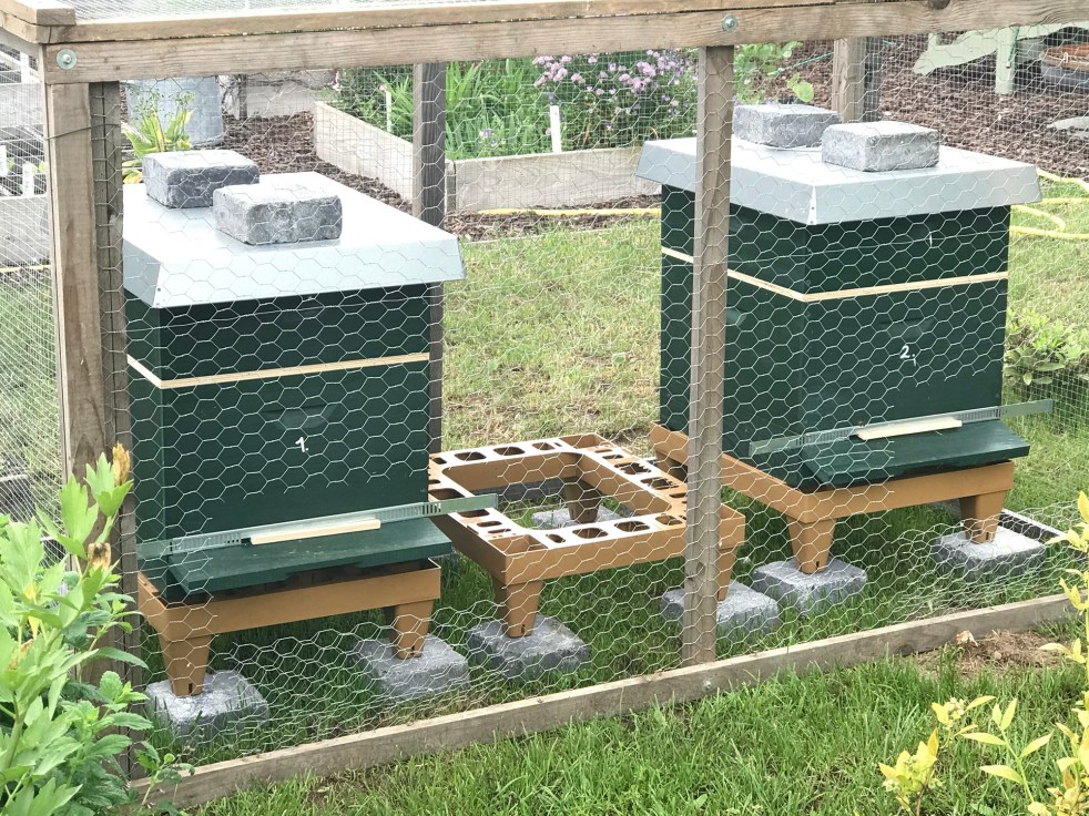 Wanneer manlief klaar is met zijn bezigheden kunnen we samen de kasten van binnen gaan bekijken. Op dit moment staan de honingkamers nog onder de broedkasten. Deze honingraten zullen nu wel allemaal leeg en schoon gemaakt zijn door de bijtjes. Dan is dit een mooi moment om de honingkamers bovenop de broedkasten te plaatsen met een koninginnenrooster ertussen. Aangezien het bijenjaar nu al onvoorspelbaar verloopt en het broed wellicht snel groter zal worden geven we de bijen op deze manier de ruimte. Waarbij we ervoor zorgen dat de koningin alleen daar eitjes kan leggen waar wij dat graag hebben. En dat is niet in de honingkamer.