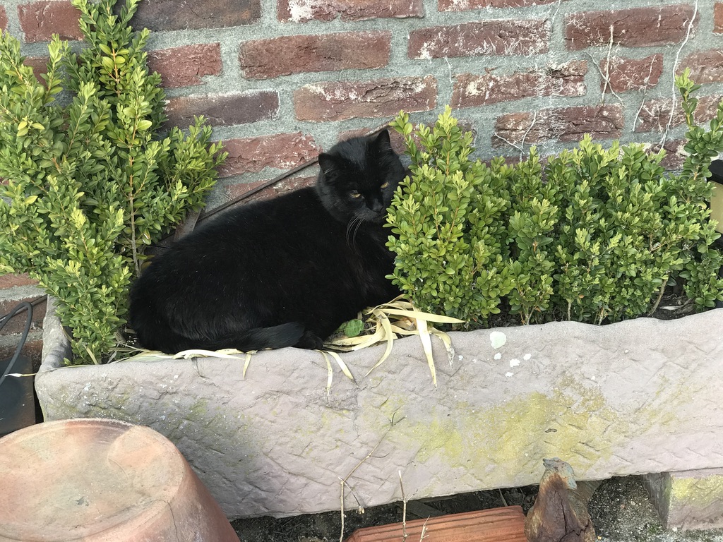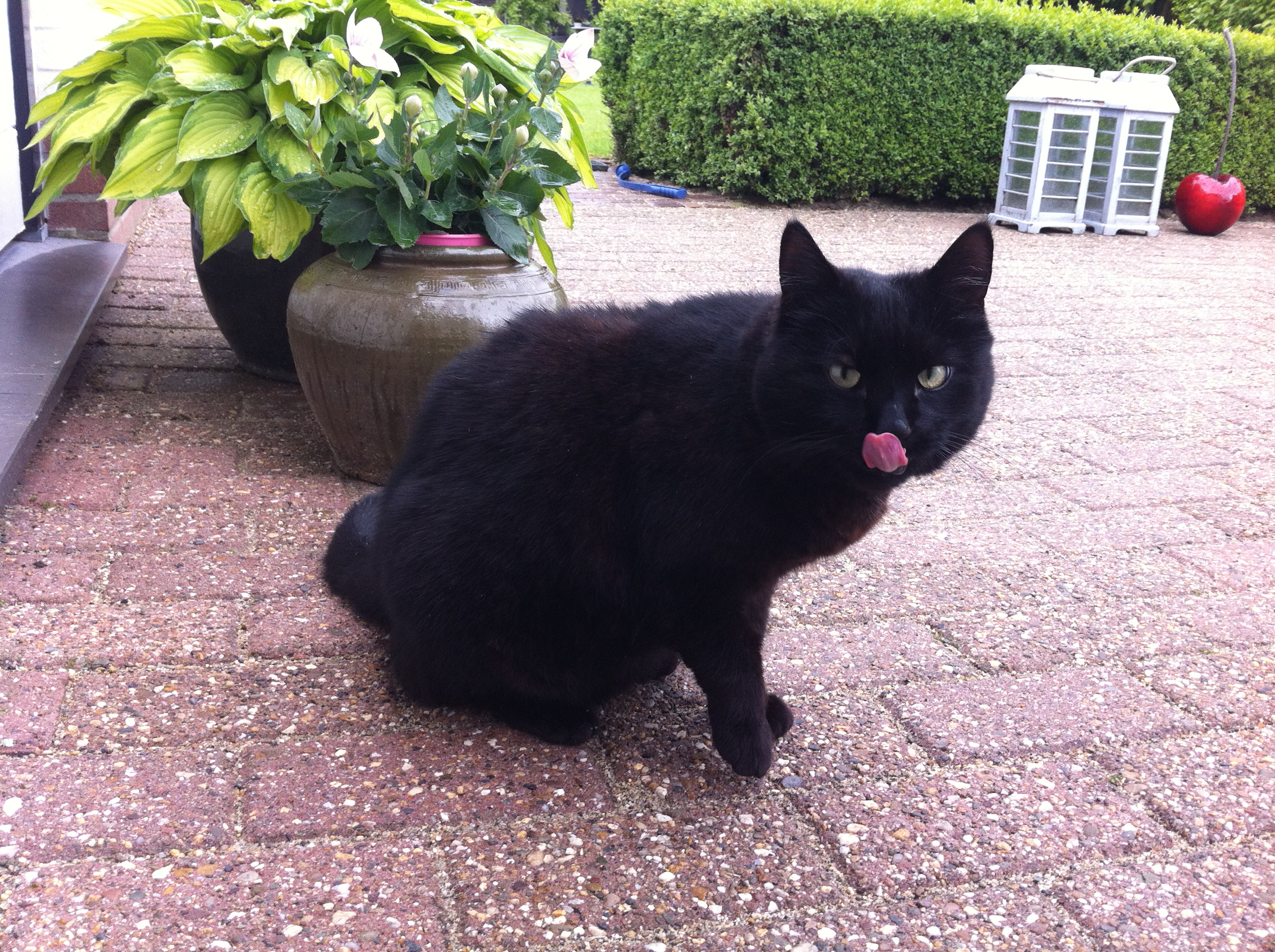Sinds een aantal dagen ligt hij overdag alleen maar onder de beukenhaag te liggen. Hij is sloom en lijkt pijn te hebben. Hij wil niet binnen blijven. Binnen is het hem te warm en krabbelt hij steeds aan de deur om naar buiten gelaten te worden. Omdat hij heel slecht ziet doen we hem ‘s nachts in het tuinhuis. In huis zouden Maudje en Greumelke hem lastig vallen. In het tuinhuis heeft hij rust. Wanneer dan ook zijn drinkbakjes steeds leeg zijn ‘s morgens én zijn kattenbak boemvol, besluit ik om een afspraak te maken bij de dierenarts.