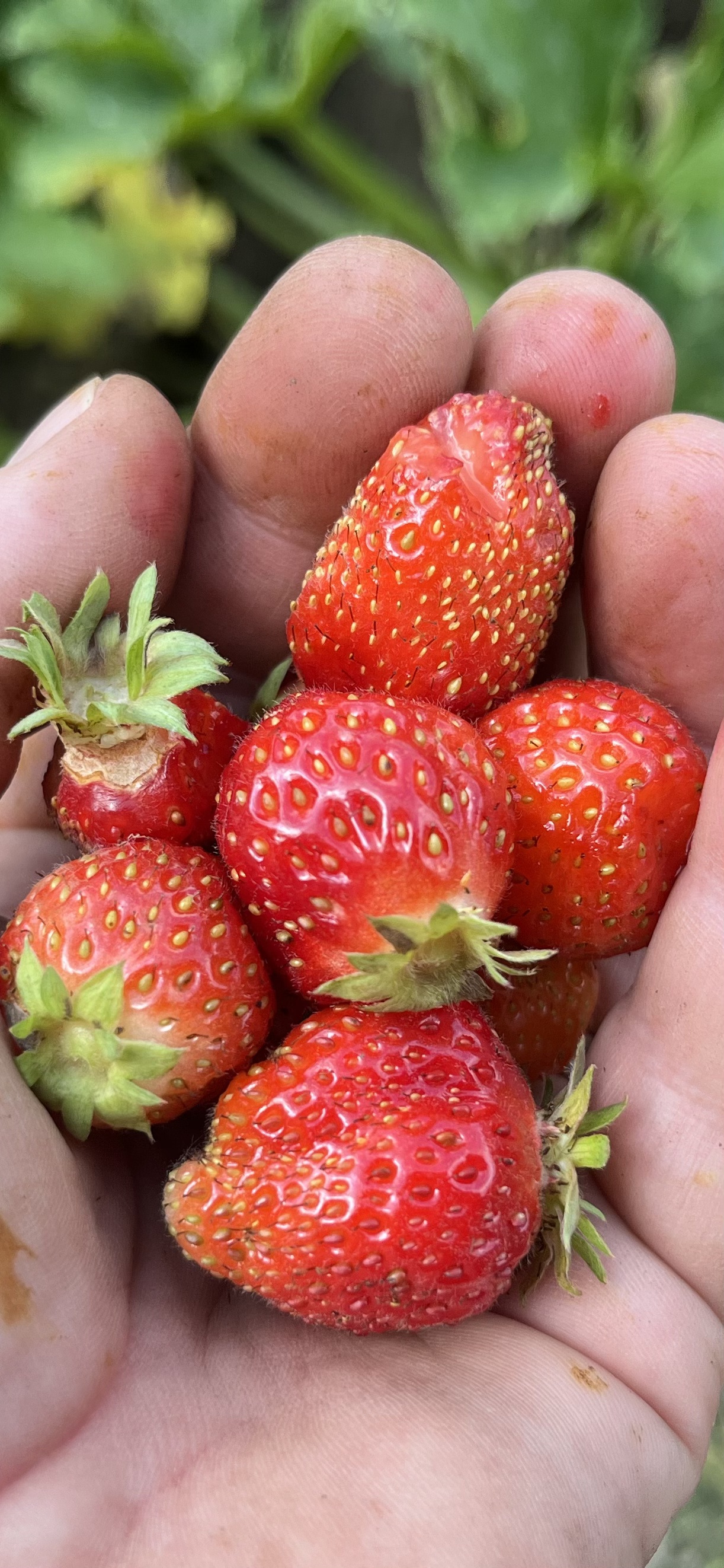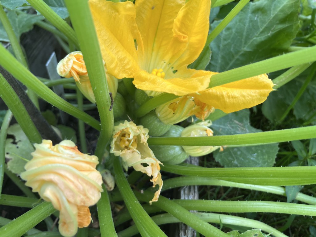 Eindelijk kan ik wat oogsten en beginnen de bloemen te pronken. De dahlia’s beginnen te bloeien, het wild mengsel is eindelijk opgekomen. De sla kan gesneden worden, de andijvie ook, de erwten zijn helaas niet goed opgekomen, fenegriek doet ook moeilijk maar de courgettes! Die doen het goed. De flespompoenen beginnen zich te vormen, de blauwe bessenstruiken hangen vol en er zijn nog wat aardbeitjes. Ook deze zijn grotendeels verregend en aangevreten door de slakken maar ik kan er af en toe nog een paar plukken. Zo tussen het wieden door. Want dat heeft uiteraard wel geprofiteerd van de regen! Een onkruid! Enorm. Geen nuttig onkruid, nee, natuurlijk niet. Maar zo’n gras dat zich ook nog erg lastig laat weghalen. Ik vraag me af en toe echt af waarom ik dit eigenlijk nog wil.