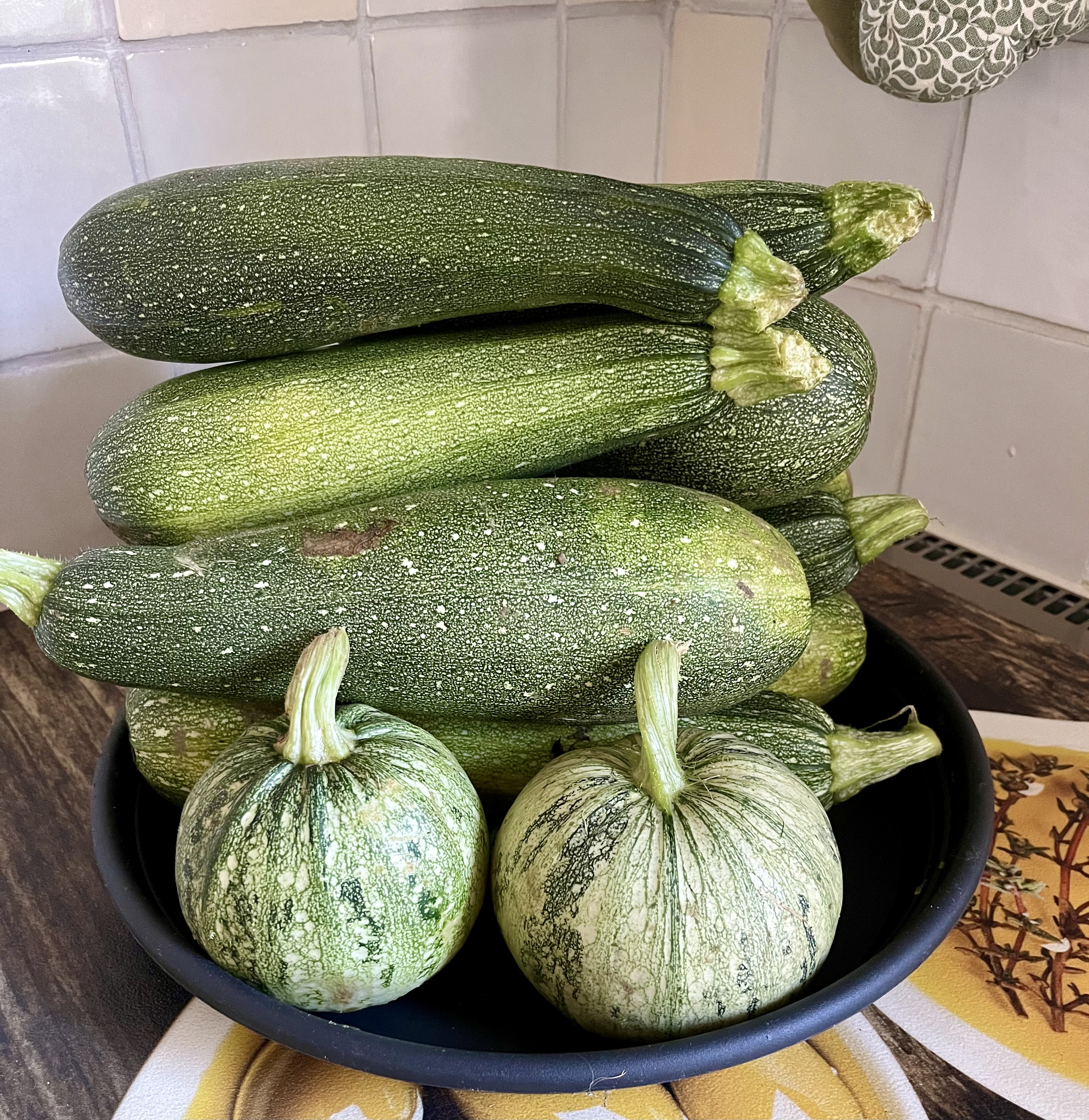 Maar toch zijn er eindelijk ook dingen die wél goed gaan. De tomaten in de kassen doen het, na een moeilijke start, prima. De paprika’s ook. En de courgettes, zoals al eerder gezegd, ook. Bolcourgettes en gewone. Mmm… En als de courgette op gang is gekomen, dan blijft ze leveren. Veel. Heel veel. Daarom ben ik zoek geweest naar lekkere recepten. Een aantal voor directe consumptie en een aantal om in te maken. Afgelopen week heb ik, met het warme weer, gazpacho gemaakt van courgette, basilicum en komkommer. Wat knoflook erbij. Heerlijk. Een echt zomer soepje dat je koud nuttigt en dat meteen bij draagt aan de noodzakelijke 250 gram groente per dag. Dat moeten we hebben. Courgetterepen op een satéprikker, beetje olie en wat sojasaus en dan op de bbq. Ook lekker. Courgetterepen in een muffin vorm doen en hieraan een geklopt eitje toevoegen en dan de oven in. Mmm. Maar voor de inmaak blijft mijn recept zoetzuur toch wel favoriet. Dus, terwijl ik dit typ, staan er drie kilo courgette stukjes te trekken in zout. En ga ik straks weer verder met de rest van het recept.