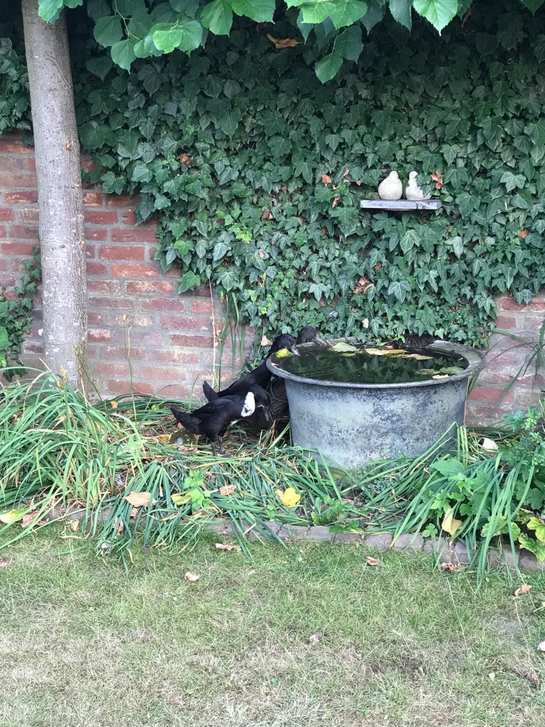 En ja, het geslacht is inmiddels duidelijk. We hebben drie dames. Ze kwaken en snateren dat het een lieve lust is. Zeker wanneer ze met hun pootjes in de modder kunnen staan en hier met hun bek in kunnen wroeten. We laten het nog een tijdje zo. Tot ze helemaal zijn volgroeid. Wanneer we echt helemaal zeker weten dat het meisjes zijn. En dan gaan we ons groepje nog eens uitbreiden met een mannetje. Een mooi mannetje met een krul in zijn staart.