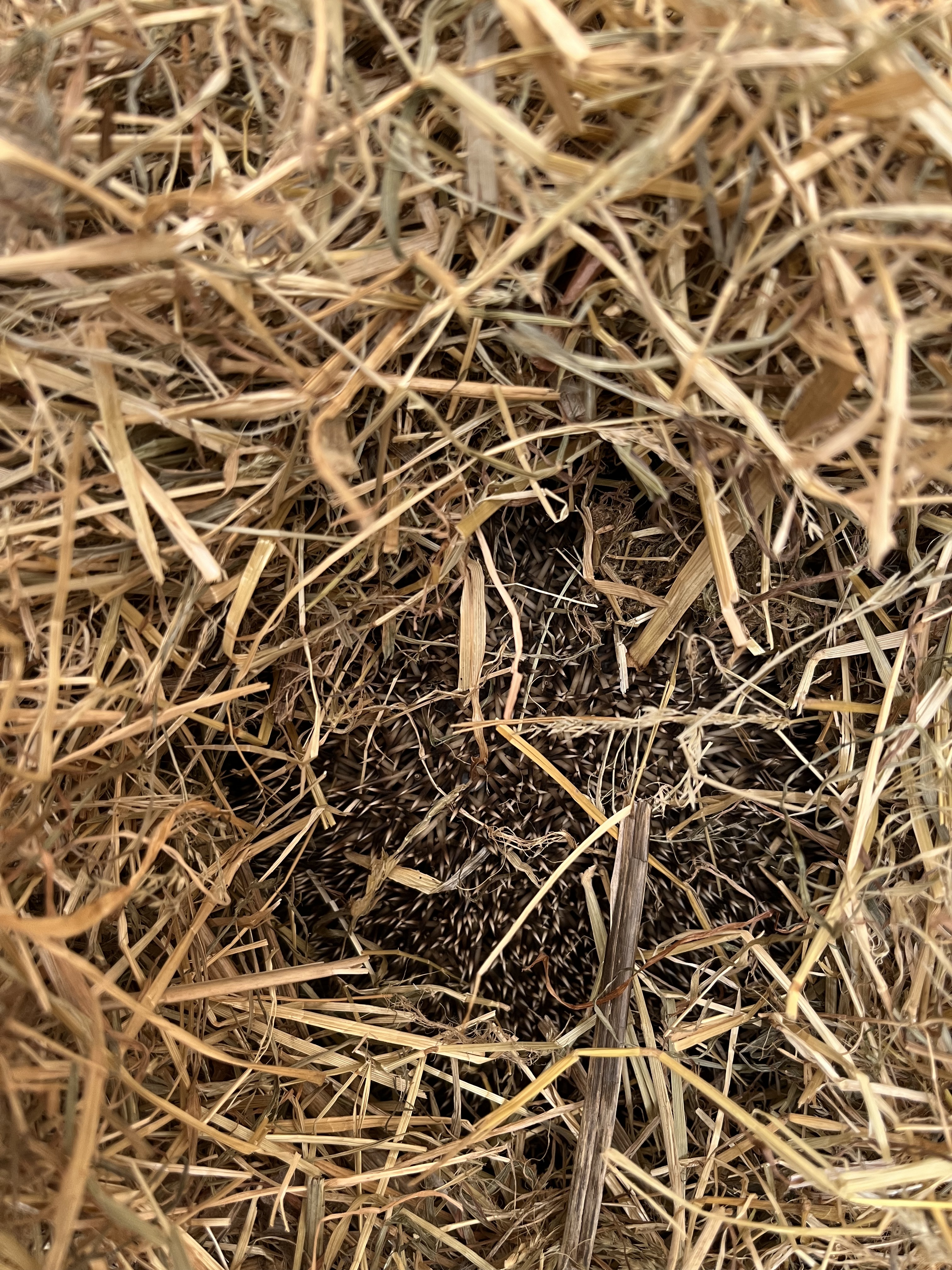 Vandaag echter lag er geen ei. Toen ik Blondie terug in het nachthok wilde doen, dacht ik ‘even kijken of er een ganzenei ligt’. En automatisch bukte ik me om het hooi wat opzij te schuiven en meteen rond te voelen of er een ei lag. “Au!” In een reflex trek ik mijn hand terug. Mijn hand is zojuist in contact gekomen met iets wat heel erg prikt. Nieuwsgierig steek ik nogmaals mijn hand uit. Iets voorzichtiger deze keer. Om dan vertederd te kijken naar een egel die zich heeft opgekruld in zijn hooinestje. Het voelt heerlijk warm. Ik dek hem snel weer toe. Laat hem maar lekker liggen. De temperatuur gaat weer dalen en hier ligt het egeltje prima. Op een klein detail na dan. Zou onze gans ook geprikt zijn door de egel? Ik zie het helemaal voor me. Gaat ze lekker haar eitje leggen, wiebelt ze even met haar kontje om een holletje te maken en schiet ze van schrik overeind omdat er iets in haar kont prikt! Hahahaha! Toch loop ik de plekjes in de wei even na om te kijken of er niet ergens een verdwaald ganzenei ligt. Dat is niet zo. Maar dat onze gans haar ei voorlopig niet op haar vaste plekje kwijt kan, dat is een ding wat zeker is.