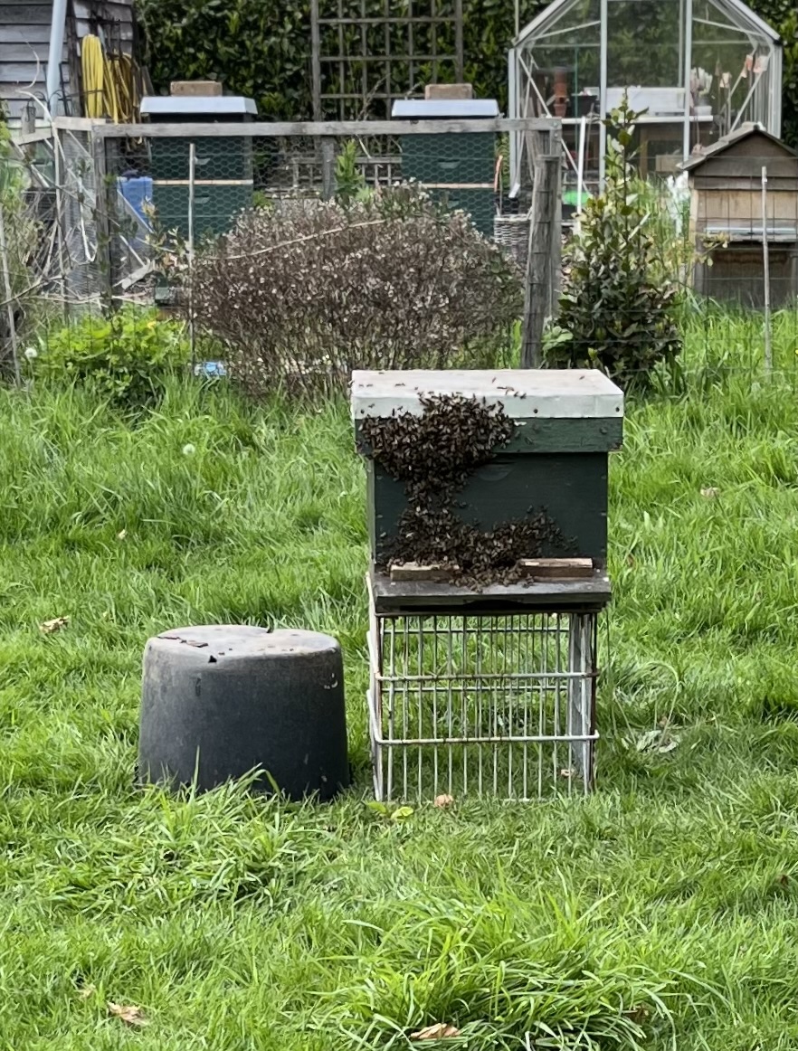 Daags erna was manlief de haag aan ’t scheren toen het festijn van start ging. De bijen begonnen zich op het hekwerk voor de kasten te verzamelen. Het aantal groeide gestaag. Na manlief gehaald te hebben, de nodige spullen klaar gezet te hebben en mijn bijenpak te hebben aangetrokken, bekeken we het gebeuren van alle kanten. Toen er echt veel bijen op het raamwerk zaten besloten we, na enige discussie, om te proberen de bijen in een kleine kast te vegen voordat de hele zwerm zou vertrekken. We gingen ervan uit dat de koningin op het hekwerk zat om haar volk om zich heen te verzamelen.