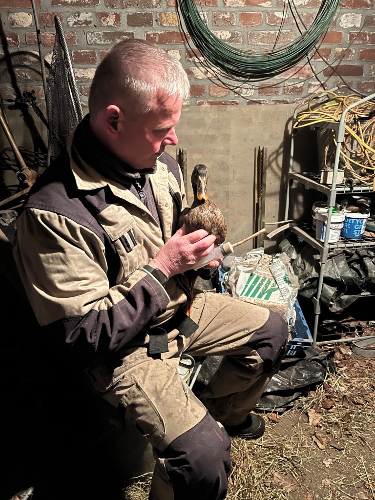 Sinds oud en nieuw kan Broene, één van onze twee loopeendjes, niet meer lopen. Ze ligt stil op haar plek met haar poten gestrekt naar achteren. Wanneer we haar oppakken en afvoelen kunnen we niets vinden. Geen duidelijke oorzaak. Er zit geen ei in de weg. Haar drinkwater was steeds schoon. Daarbij is het te koud voor botulisme maar ze reageert ook gewoon goed. Kijkt ons aan. Probeert weg te kruipen wanneer we haar op willen pakken. Maar steunt af met haar vleugels. Heel vreemd. We bellen weer eens met de dierenarts maar kunnen pas 2 januari terecht.