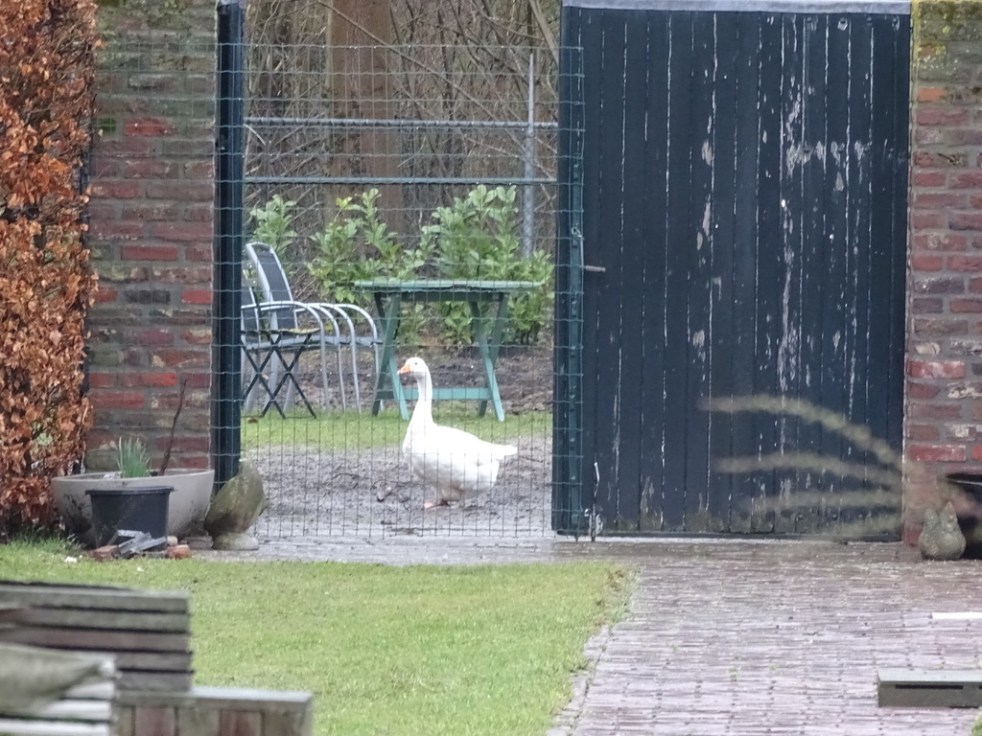 Daags na het euvel zit Meisje nog braaf in de garage in Snor’s hok en zit Gijs als een trouwe wachter bij de poort. Zielig op één been te slapen en te loeren naar onze deur. Manlief is al vroeg weg en daarom is het mijn beurt om te voeren vandaag. De ganzen zijn duidelijk bang voor me en dat is niet gek natuurlijk. Gisteren waren ze getuige van het feit dat we Meisje moesten vangen en daarna is ze niet terug gekomen. Uit ervaring weten we dat dit een tijdje gaat duren. Daarom zet ik de poort naar de tuin toch maar weer open. Eigenlijk heeft manlief vorige week alles netjes lenteproof gemaakt, alle ganzenpoep opgeruimd en was het de bedoeling dat ze voortaan weer alleen in de wei zouden moeten blijven. Maar dit is een uitzondering vind ik. Ze krijgen de kans om Meisje te horen als ze zich in de tuin ophouden. Zo kunnen ze te weten komen dat ze nog leeft. Wat denk ik voor Gijs heel belangrijk is. Niet dat hij de eerste tijd in haar buurt mag komen vanwege de absolute rust maar toch. Te weten dat ze ergens nog is lijkt me wel prettig voor hem. Of vul ik het nu ook weer in aan de hand van mijn menselijke interpretaties? Maar dat Gijs haar mist is duidelijk.