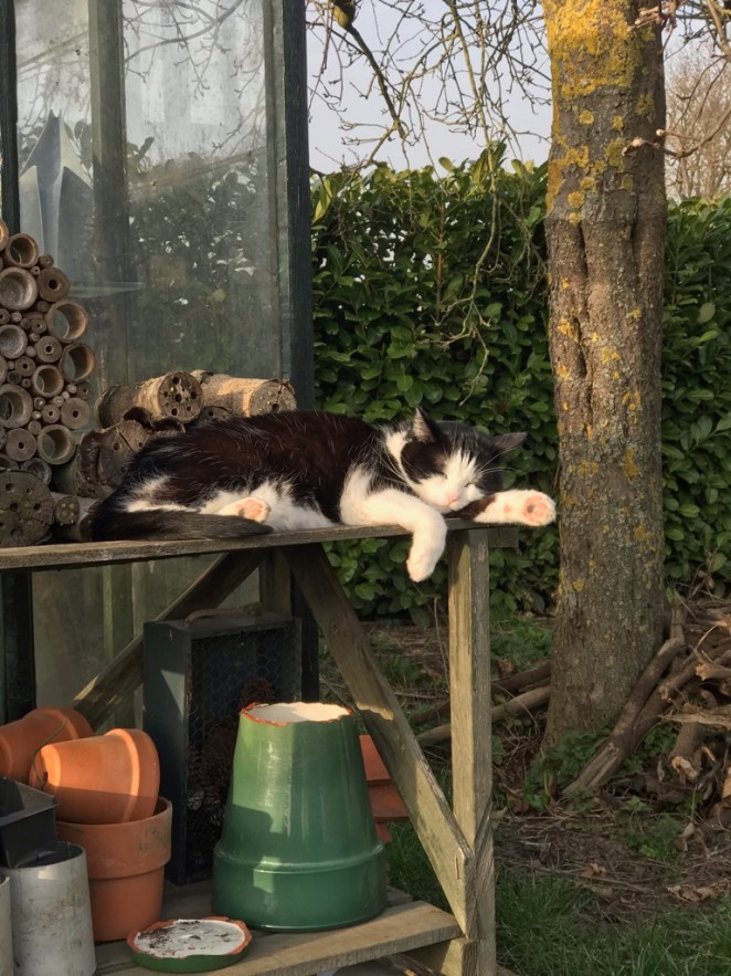 Ik sta tussen mijn moestuin bakken. Triest kijk ik om me heen. Een project dat er niet van is gekomen dit jaar. Geen puf voor. Alsof ik dit vorig jaar voorzien heb, heb ik in twee bakken bollen gepoot met bij-vriendelijke bloemen. En in de aardbeienbak heeft zich Ijzerhard gezaaid. Verbena. Bomvol staat deze te stralen met paarse bloemstengels die maar blijven groeien. In de andere twee bakken staan nog wat kruiden en munt. De munt heeft zich overal uitgezaaid. Aan één kant heeft het langs het hekwerk een haag gevormd. Ik laat het maar zo voor nu.