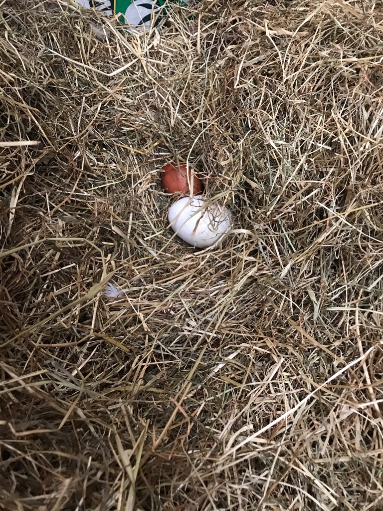 Sientje, de Marans, heeft daar nu ook al last van. Zij heeft het hooi gevonden dat opgeslagen ligt naast het nachthok van de eendjes. Zorgvuldig heeft ze zich achter een paar planken een nestje gedraaid met haar zwartgeveerd kontje. Om daar een heel mooi donkerbruin eitje in te vleien. Wanneer ik dit ei raap, zie ik in de hooibaal een groot gat zitten. Daar trekken de ganzen blijkbaar het hooi weg voor het groter maken van Sientjes nest want ja, ook een van de ganzen blijkt dit een prima plekje te vinden. En dan komt het dus voor dat een donkerbruin eitje gezellig in een nest ligt met een ganzenei. Maar dat is nog niet alles. Wanneer ik deze twee eieren weer raap komt de araucana ineens uit het gat in de hooibaal geschoten. Zij is blijkbaar geschrokken van het gerommel van mij in het hooi want ja, het moet niet gekker worden met dat leegtrekken van de hooibaal. En ik schrik me een hoedje wanneer er ineens een kip bijna tegen mijn hoofd aanknalt.