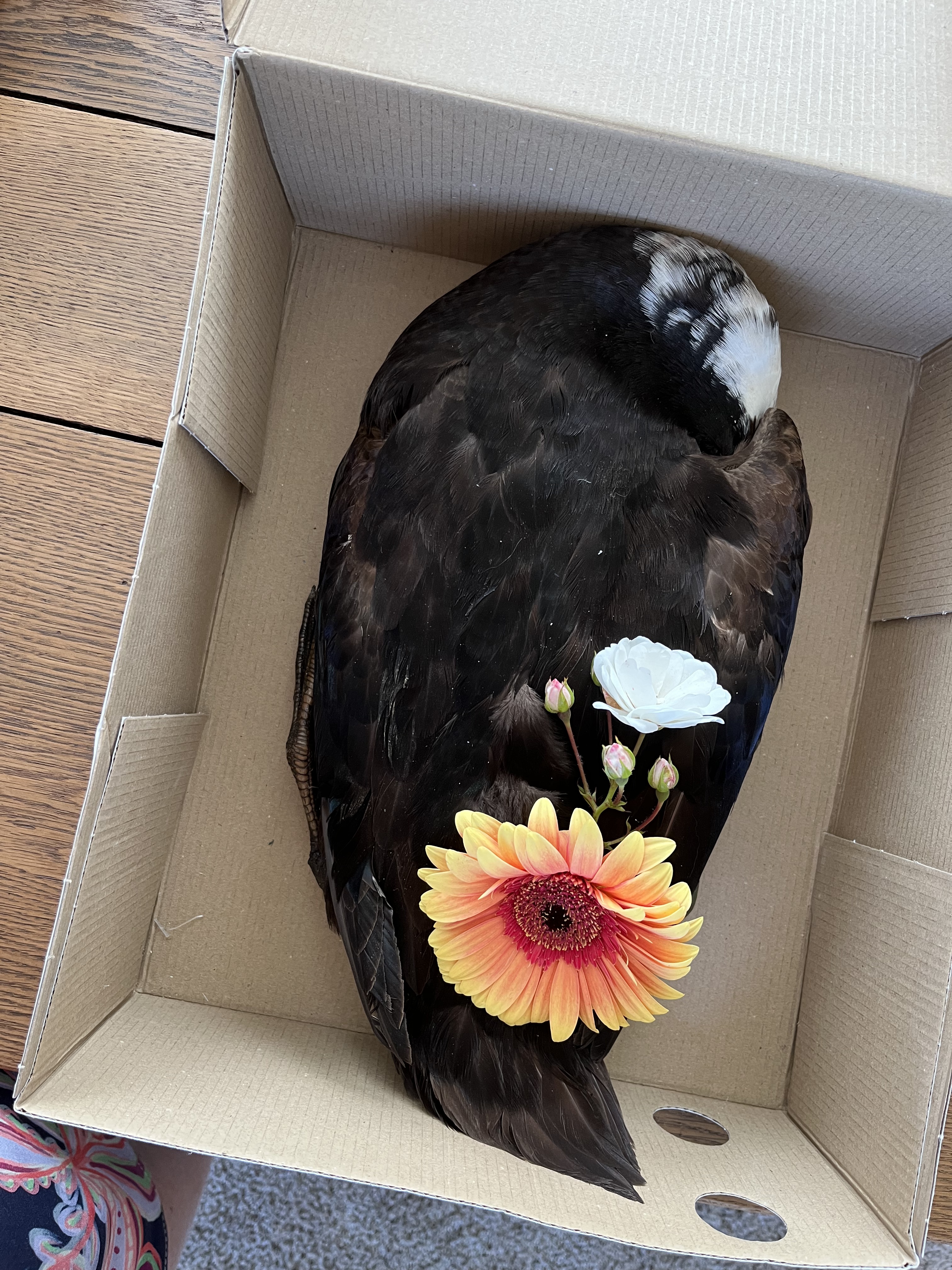 Het is gelukkig niet druk op de weg. We komen rond 11.30 uur aan. H is werken. Haar zoon zou thuis zijn. Wanneer we aanbellen doen dochter en zoon de deur open. Eenmaal binnen brengen ze ons Blondie. Ze ligt in een schoenendoos met haar kopje in haar veren alsof ze slaapt. Heel lief is er een mooie oranje gerbera tussen haar veren gestoken. Eigenlijk willen we meteen weer gaan. Want weer zit ik helemaal op slot. Toch nemen we de uitnodiging van H’s zoon aan om even in de tuin te kijken. Kennis te maken met Blondies nieuwe familie. We lopen rond tussen de eendjes die vrolijk op ons af komen. Zien mooie kippetjes en een kip die rondloopt met haar eendenkuikens die ze heeft uitgebroed. H’s zoon vertelt ons dat zijn moeder vanochtend helemaal uit haar doen was. Dat geloof ik graag. Dat waren wij ook na haar bericht. Hij laat ons de zwembadjes zien waar de eendjes normaalgesproken lekker toteren. En vertelt daarbij dat het zo grappig was dat hun eenden totaal niet zwommen tot Blondies komst. Omdat zij wel ging zwemmen begonnen de andere eendjes dat ook te doen. Op de een of andere manier helpt deze anekdote me. Ik vond het fijn om te horen. Geen idee waarom juist dit me helpt? Ik vond het ook fijn om even rondgelopen te hebben. Te zien dat Blondie goed terecht was gekomen en omringd werd door veel liefde voor dieren. Ook dat helpt me.