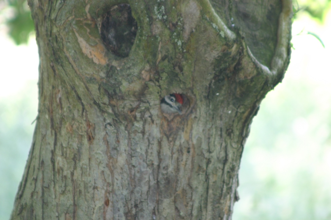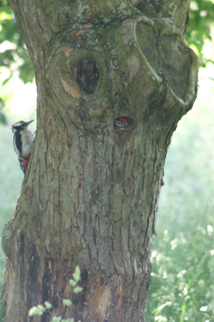 Ineens was er één specht. Hij ging ergens in de buurt in een boom zitten en bleef daar een tijdje kijken of alles in orde was. Geluidloos. Het duurde dus even voordat we dit in de gaten hadden. Blijkbaar vond hij ons niet zo interessant want op een bepaald moment kroop hij op de stam en begon rondjes te lopen. De kleintjes hadden in de gaten dat er een ouder in de buurt was want die begonnen nog harder te kwaken. Ik noem het maar kwaken. Piepen komt niet eens in de buurt van de benaming van het geluid. Uiteindelijk stopte de specht voor het holletje en voerde de kleintjes. In een andere boom zat de andere specht af te wachten en ging naar het holletje toen de ene specht wegvloog. Dat gebeurde wel met een klein geluidje.