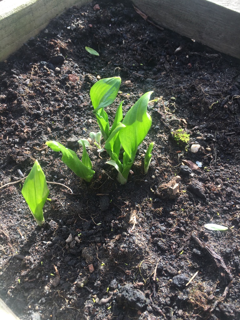 Voorlopig blijft het daarom nog even bij inspecteren, inventariseren, opruimen en plaats en plannen maken. Met af en toe een kopje koffie op een beschut plekje in de zon. En genieten van de plantjes die al wel opkomen, zoals het daslook.