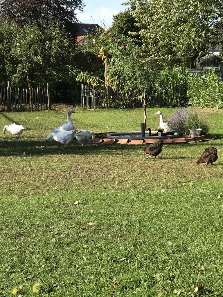 Zoals gebruikelijk de laatste paar weken, sluiten we onze dag af in de wei, onder de kastanjeboom. De eendjes rennen enthousiast rond en de kippen mogen ook uit de ren. Ze staan al vol ongeduld te trappelen om losgelaten te worden.